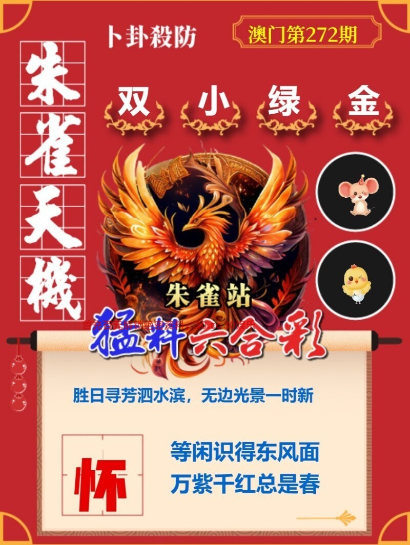 277期:妙解朱雀天机 江雨霏霏江草齐,六朝如梦鸟空啼 解:江雨霏霏江草齐,六朝如梦鸟空啼 解猪鼠牛 无情最是台城柳,依旧烟笼十里堤 解:无情最是台城柳,依旧烟笼十里堤 解兔龙蛇马羊猴 玄機測字:《何》 解:“何”担负的意思,后多作为疑问代词,表示什么、为什么等义,同時它也是一個姓氏。 综合七肖:兔龙蛇马羊猴猪 综合五肖:兔龙蛇马羊 综合三肖:兔龙蛇 综合一肖:兔 |